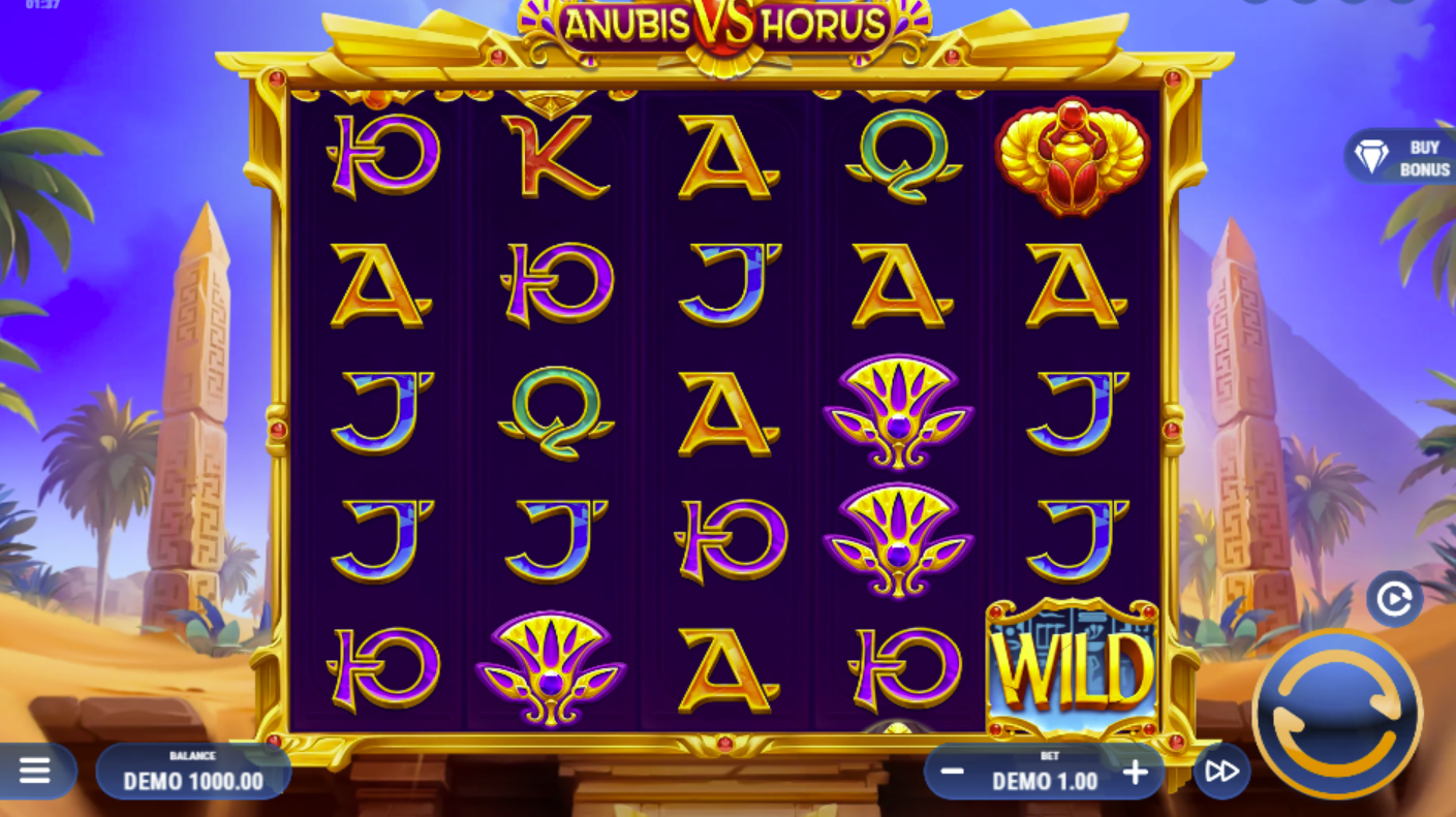 - Revolutionary Twin Reel System: Two independent 5-reel sets operate simultaneouslyAnubis commands the left reels, Horus the right. Wins are calculated separately, with special features triggered by their divine interaction.